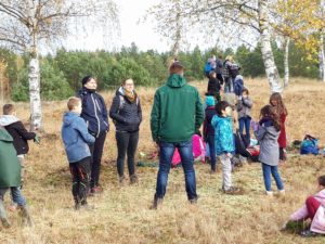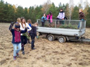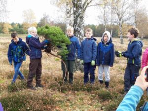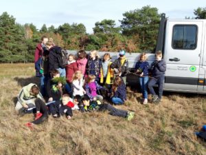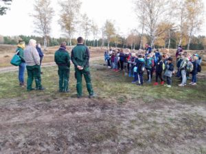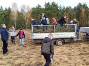 Unsere diesjährige Entkusselungsaktion in der Nemitzer Heide fand am 11. November mit der Grundschule Lüchow statt. 85 Schülerinnen und Schüler entfernten unter Anleitung von Mitarbeitern des Naturparks Elbhöhen-Wendland und Aufsicht von 5 Lehrerinnen aufwachsende Kiefern von den sandigen Heideflächen. Der Naturpark hat – im Rahmen seiner jährlichen Naturparktage – für die Aktion zwei Busse für die Fahrt von der Grundschule zum Einsatzort und zurück organisiert. Die erste Vorsitzende Dr. Petra Dittberner begrüßte die fleißigen Helferinnen und Helfer vor Ort und gab eine kurze Einführung in die Thematik. Entkusseln bedeutet „Kiefern zupfen“ – damit auf den Flächen der Nemitzer Heide kein Kiefernwald aufwächst, sondern die wichtigen Lebensräume „Sandtrockenrasen und offene Binnendünen“ erhalten bleiben. Sie sind ein Dorado für Insekten. Und diese sind unverzichtbare Nahrungsquellen für Spinnen, Vögel und Reptilien.